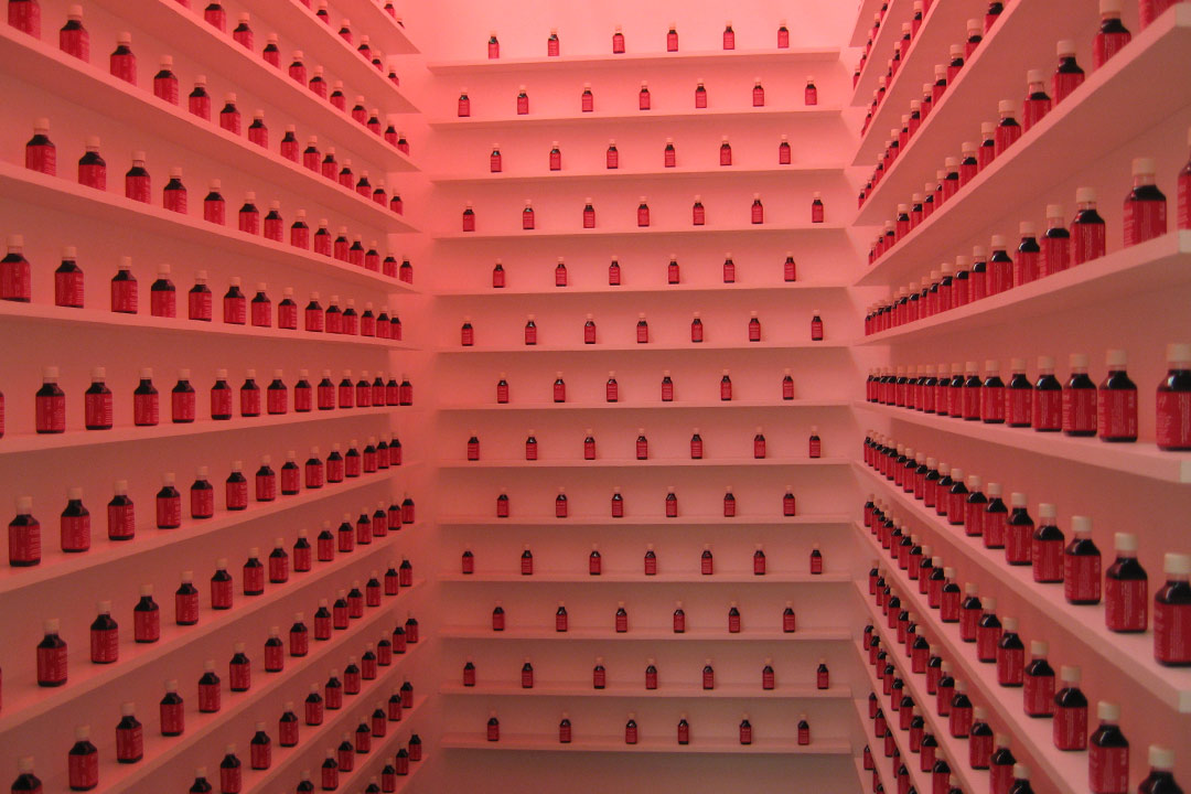 ഈ ഇൻസ്റ്റലേഷന്റെ പ്രധാന ഭാഗം, രക്തത്തിന്റെ നിറമുള്ള ദ്രാവകം നിറച്ച ചെറിയ പ്ലാസ്റ്റിക് കുപ്പികളാണ്. ഓരോ കുപ്പിയുടെ ലേബലിലും ഇങ്ങനെ എഴുതിയിരിക്കുന്നു: "നിങ്ങളെ പഴിക്കുമ്പോൾ എനിക്ക് നല്ല സുഖം തോന്നുന്നു, അതുകൊണ്ട് നിങ്ങൾക്ക് നിയന്ത്രിക്കാൻ കഴിയാത്ത നിങ്ങളുടെ മതം, നിങ്ങളുടെ ദേശീയത എന്നിവയുടെ പേരിൽ ഞാൻ നിങ്ങളെ പഴിക്കുന്നു."