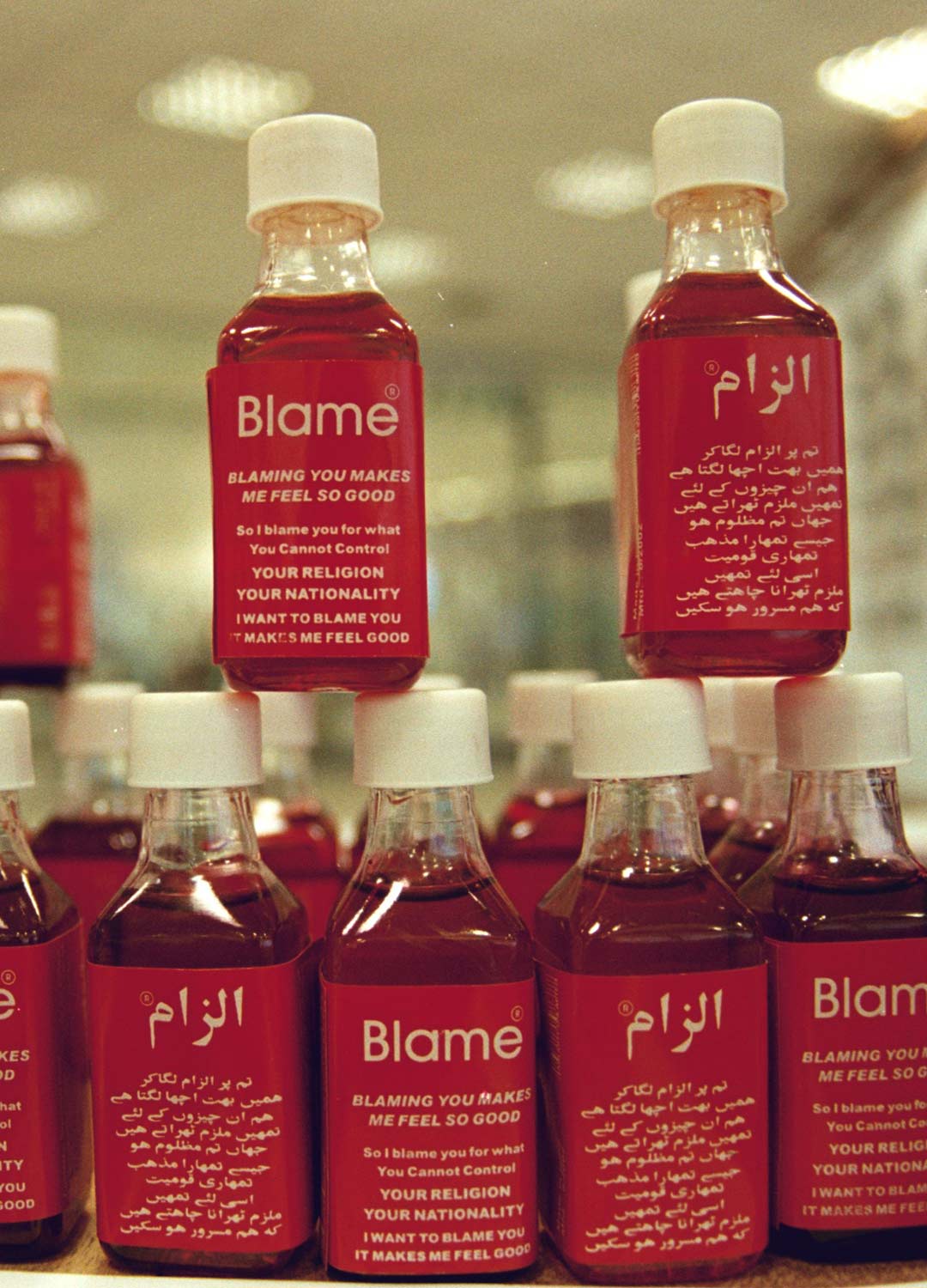 ബ്ലേം ബോട്ടിലുകൾ, പോസ്റ്ററുകൾ, സ്റ്റിക്കറുകൾ, വീഡിയോ, ഇന്ററാക്ടീവ് പ്രകടനം എന്നിവ അടങ്ങുന്ന ഒരു ഇന്ററാക്ടീവ് ഇൻസ്റ്റലേഷനാണ് ഈ സൃഷ്ടി.