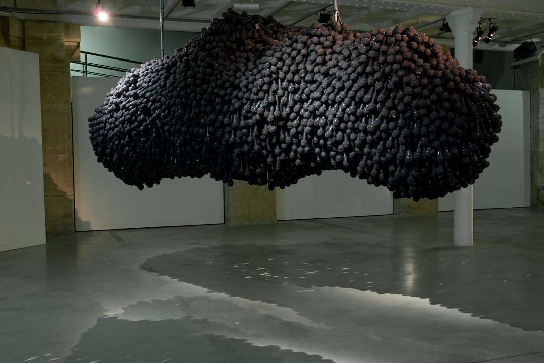 ‘സിംഗിംഗ് ക്ലൗഡ്’(Singing Cloud) എന്ന ഇന്സ്റ്റലേഷനില് ഒരു വലിയ പ്രദർശന സ്ഥലത്ത് പ്രവേശിക്കുമ്പോള് സീലിംഗിൽ നിന്ന് തൂങ്ങിക്കിടക്കുന്ന ഒരു വലിയ, രൂപരഹിതമായ, ഇരുണ്ട പിണ്ഡം നാം കാണുന്നു. ഇത് ഒരു വലിയ ഇരുണ്ട മേഘം അല്ലെങ്കിൽ ഒരു ജൈവ രൂപം പോലെ പൊങ്ങിക്കിടക്കുന്നതായി നമുക്ക് തോന്നുന്നു. അടുത്തെത്തുമ്പോൾ, ആയിരക്കണക്കിന് കറുത്ത മൈക്രോഫോണുകൾ ഉപയോഗിച്ചാണ് ഈ ‘മേഘം’ നിർമ്മിച്ചിരിക്കുന്നതെന്ന് നമുക്ക് മനസ്സിലാകും: അവ ഒരുമിച്ച് ഇടതൂർന്ന് ഒത്തുചേർന്ന്, മുഴുവൻ ആകൃതിയും ഉണ്ടാക്കുന്നു.