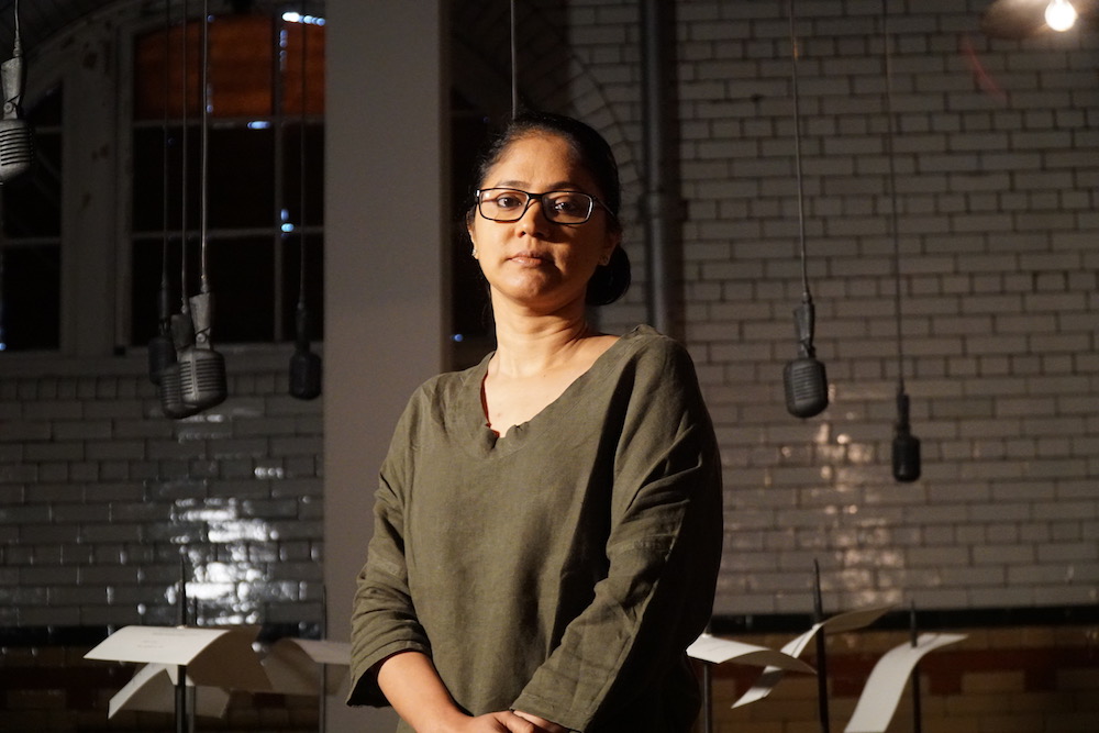 ശില്പ ഗുപ്തയുടെ ‘For, In Your Tongue, I Cannot Fit’ എന്ന സൃഷ്ടിയിൽ ഒരു വലിയ, മങ്ങിയ വെളിച്ചമുള്ള മുറി. അവിടേക്ക് കടന്നാല് ഒരു പുണ്യസ്ഥലത്തേക്കോ ശാന്തമായ ലൈബ്രറിയിലേക്കോ കടന്നുവന്നതുപോലെ നമുക്ക് തോന്നും. കണ്ണുകൾ ഇരുട്ടുമായി പരിചിതമാകുമ്പോൾ നിരവധി മൈക്രോഫോണുകൾ (നൂറെണ്ണം) സീലിംഗിൽ നിന്ന് തൂങ്ങിക്കിടക്കുന്നത് നാം കാണുന്നു. അവ വിവിധ ഉയരങ്ങളിൽ തൂക്കിയിട്ടിരിക്കുന്നു. അവ ചിതറിക്കിടക്കുകയല്ല; മുറിയുടെ മുഴുവൻ ഭാഗവും നിറച്ചുകൊണ്ട് ചിട്ടയില് നിരനിരയായി ക്രമീകരിച്ചിരിക്കുകയാണ്. അതിനാല് ഇത് ഒരു വനമോ അല്ലെങ്കിൽ ലോഹവസ്തുക്കളുടെ ഇടതൂർച്ചയായോ അനുഭവപ്പെടുന്നു.